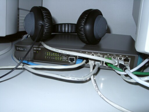 Wenn es sich um eine gemütliche LAN handelt kann man auch mal ganz gemütliche Hardware anschleppen. Ein kleiner 16 Port Switch sollte ganz und gar ausreichen für so eine kleine TrainingsLAN. Man beachte den Port Nummer 7. Ja, die dunkle LED signalisiert es ganz deutlich: Es ist X_FISH, der (mal wieder) die NIC vom DSL-Betrieb nicht auf 100 Mbit Vollduplex umgestellt hatte... Hat sich aber nicht negativ auf den kleinen dedicated HL-CS-Server ausgewirkt, welcher probeweise mal kurz über die 10 Mbit Halbduplex zu erreichen war. Zumindes kamen keine großartigen Klagen.